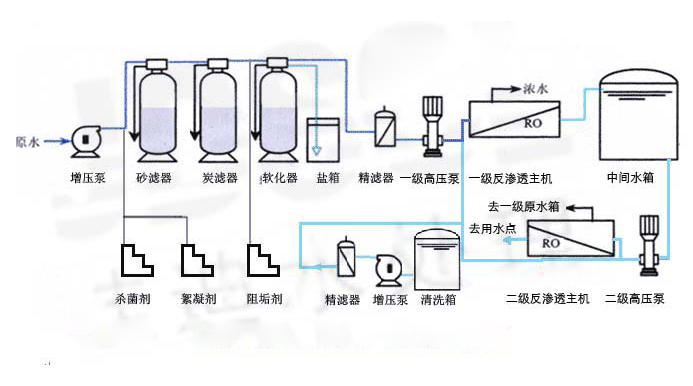 雙級反(fan)滲(shen)透(tou)是(shi)通過(guo)一級反(fan)滲(shen)透(tou)將(jiang)鹽份脫除(chu)(chu)95-97%后,一級反(fan)滲(shen)透(tou)大水(shui)(shui)(shui)利(li)用(yong)率為(wei)75%,再通過(guo)二級反(fan)滲(shen)透(tou)將(jiang)水(shui)(shui)(shui)中(zhong)的(de)(de)鹽分近一步脫除(chu)(chu),通過(guo)中(zhong)間加堿調節PH到8.3左右,產水(shui)(shui)(shui)水(shui)(shui)(shui)質(zhi)(zhi)可(ke)達1-2μS/CM2,是(shi)當(dang)今醫用(yong)供(gong)純(chun)水(shui)(shui)(shui)設備的(de)(de)主要制(zhi)取工藝,雙級反(fan)滲(shen)透(tou)通的(de)(de)產水(shui)(shui)(shui)也是(shi)EDI系統的(de)(de)優質(zhi)(zhi)進水(shui)(shui)(shui),所(suo)以通常也作(zuo)為(wei)EDI的(de)(de)前處理(li)工藝。