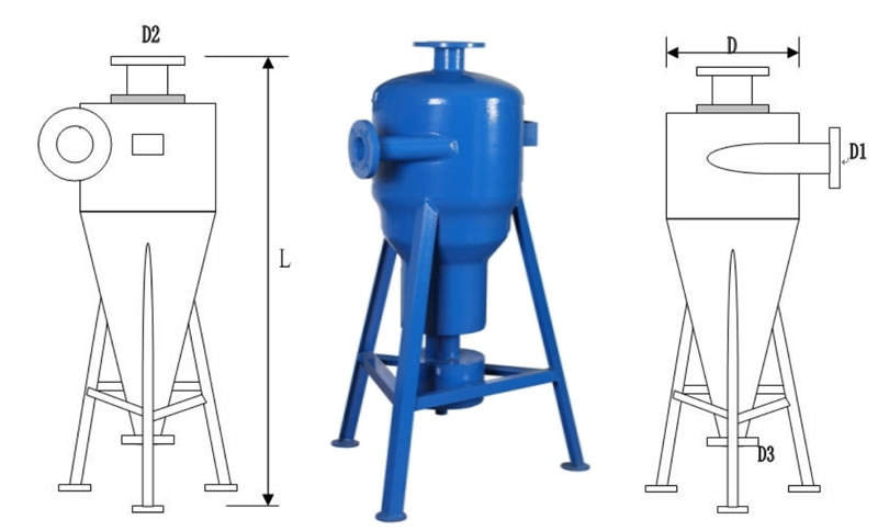 旋流除砂器是根據離心沉降和密度差的原理,當水流在一定的壓力下從除砂進水口以切向進入設備后,產生強烈的旋轉運動,由于砂和水密度不同,在離心力、向心力、浮力和流體曳力的共同作用下,使密度低的水上升,由出水口排出,密度大的砂粒由設備底部的排污口排出,從而達到除砂的目的。
