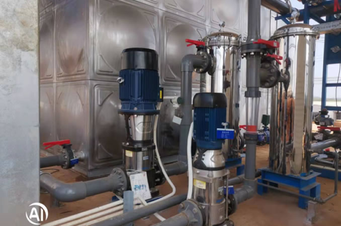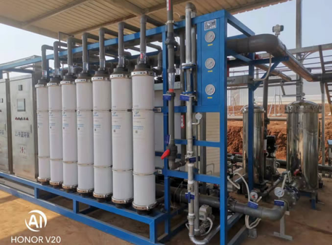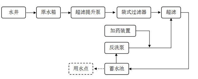 水(shui)(shui)處理設(she)計(ji)額定(ding)出水(shui)(shui)量為(wei)50m³/h,原水(shui)(shui)為(wei)井水(shui)(shui),經過袋式(shi)過濾(lv)器、超濾(lv)處理后,進蓄水(shui)(shui)池(chi)儲存,超濾(lv)產水(shui)(shui)經過水(shui)(shui)泵增壓(ya)后送至廠區。