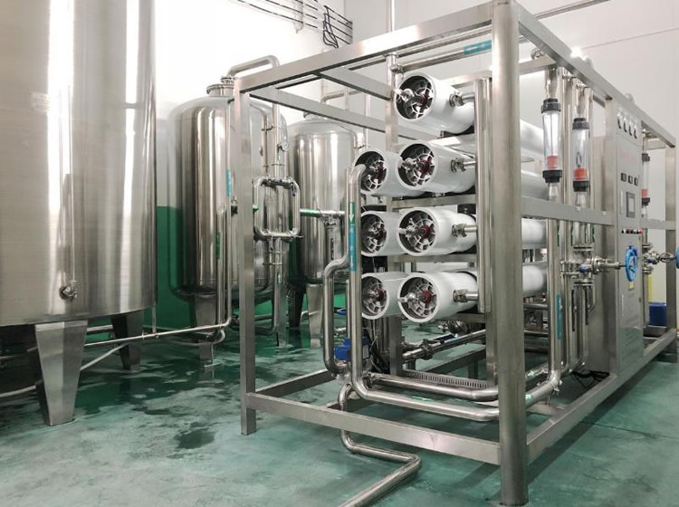 原水箱→增壓泵→多介質過濾器→活性炭過濾器→保安過濾器→高壓泵→一級反滲透→高壓泵→二級反滲透→純水箱→臭氧滅菌→成品水箱→純水泵→微孔過濾器→灌裝